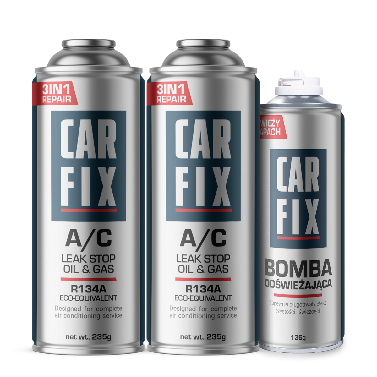 CarFix gas is completely environmentally friendly and does not contribute to the greenhouse effect. It mixes well with R134a gas, and its components and three (3) substances seal the rubber parts of the system, i.e. O-rings, while synthetic oil from the PAG group lubricates the air conditioning compressor and the gas replenishes the refrigerant to the required level.