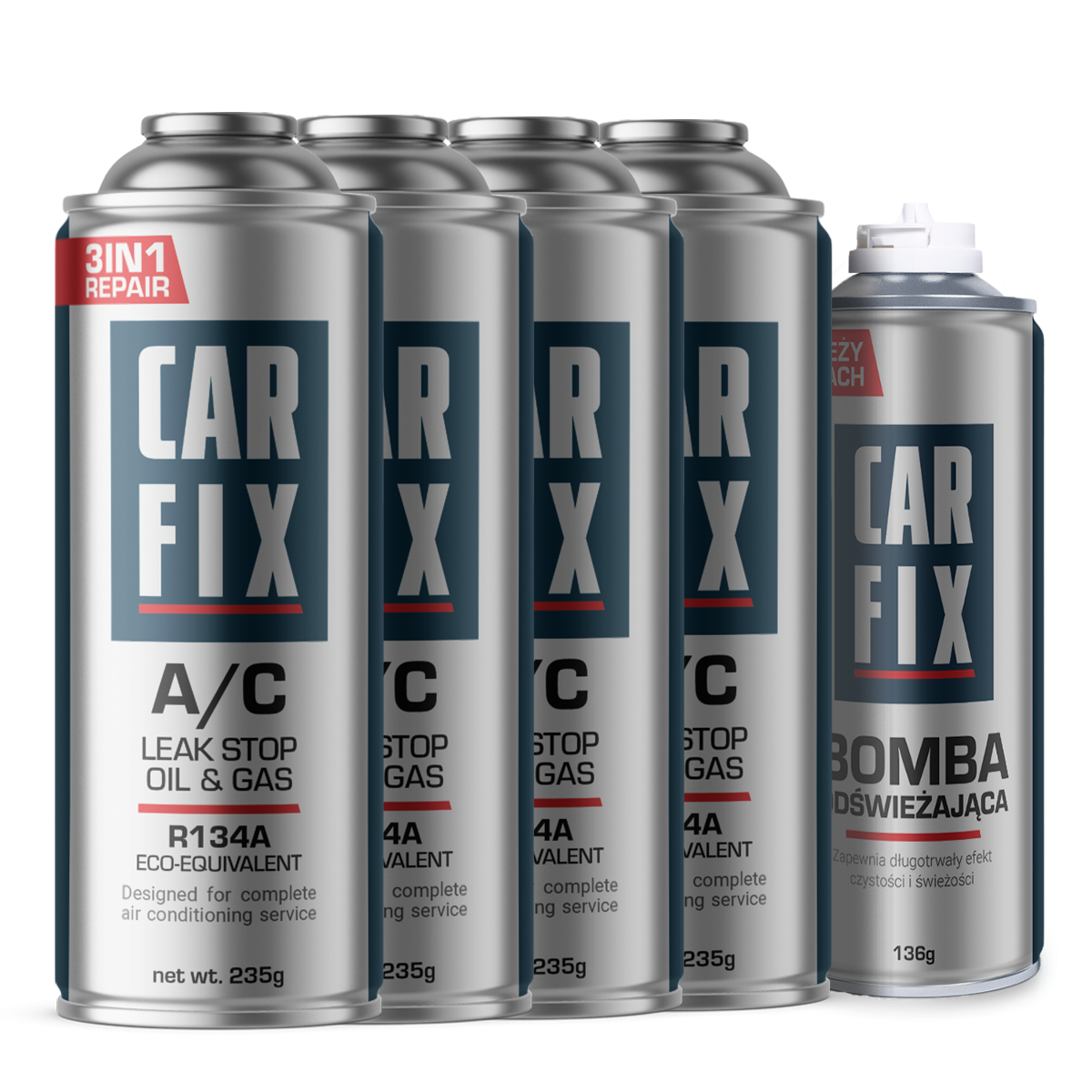 CarFix gas is completely environmentally friendly and does not contribute to the greenhouse effect. It mixes well with R134a gas, and its components and three (3) substances seal the rubber parts of the system, i.e. O-rings, while synthetic oil from the PAG group lubricates the air conditioning compressor and the gas replenishes the refrigerant to the required level.