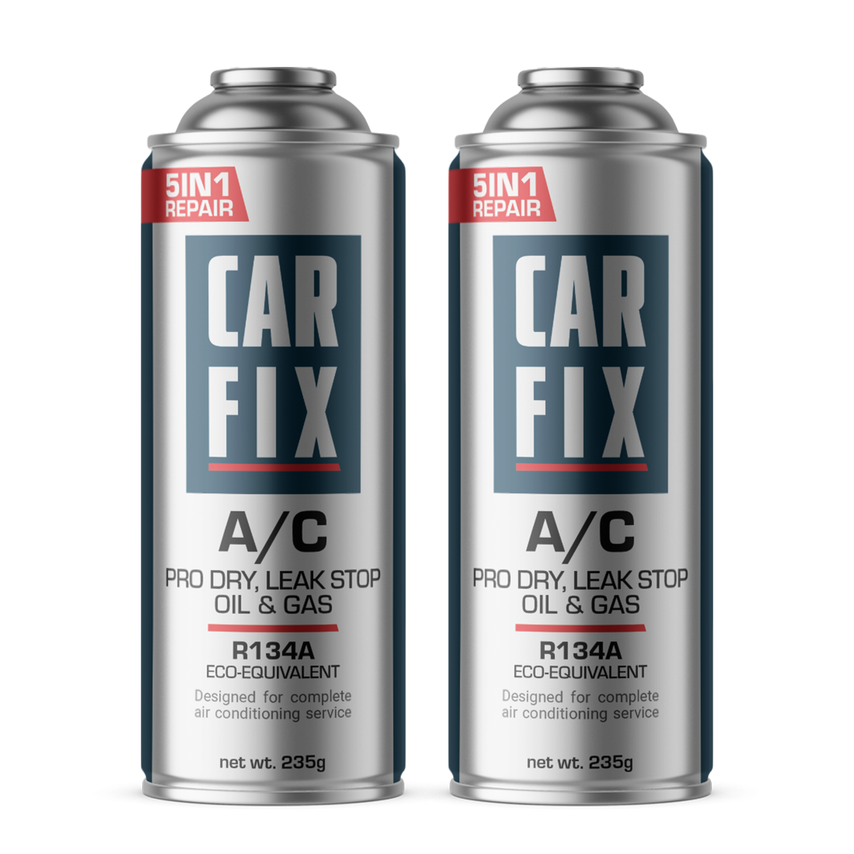 Two (2) pieces. CarFix 5-in-1 Repair R134a – R134a replacement – is a revolutionary product with comprehensive action, designed for DIY comprehensive air conditioning service in less than 5 minutes, without the need to visit a specialist workshop, without the use of specialised service tools and without creating a 23 hPa vacuum.